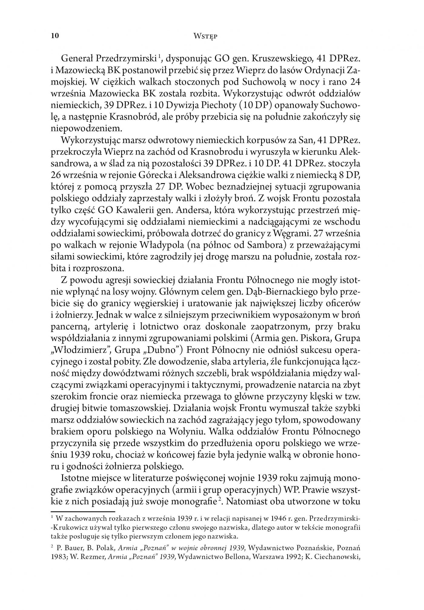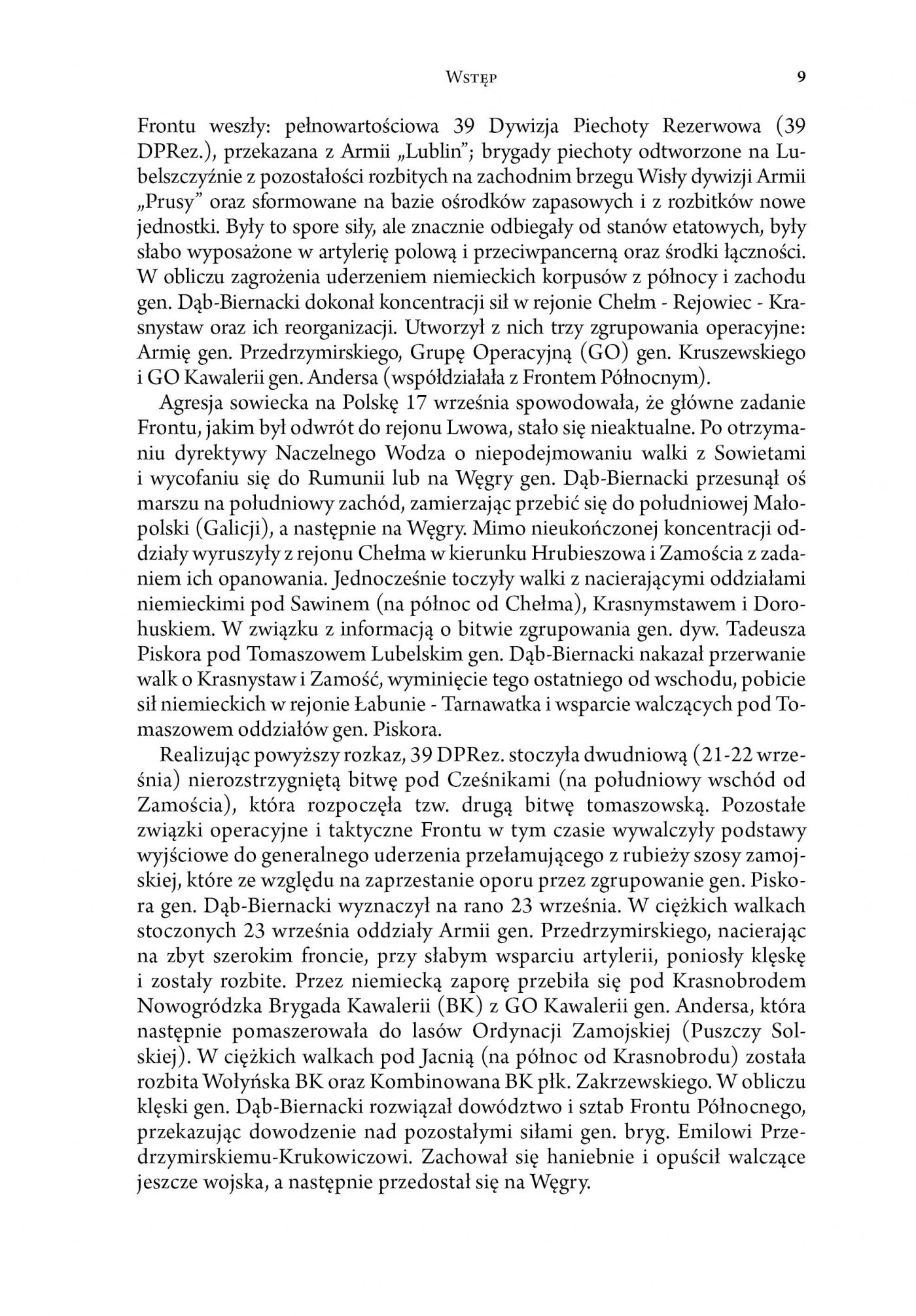 Autor przedstawił zarówno genezę powstania Frontu Północnego w ramach reorganizacji wojennego systemu dowodzenia na początku drugiej dekady września 1939 r., wcześniejsze działania wojsk, które miały wejść w jego skład, a przede wszystkim działania prowadzone w dniach 12-29 września 1939 r., zakończone ostatecznym rozbiciem wojsk Frontu Północnego. Autor ukazał tragiczny w swej wymowie obraz zmagań improwizowanych w większości zgrupowań, które w większości wypadków nie były w stanie nawiązać równoważnej walki z dysponującym przewagą techniczną nieprzyjacielem. Druga bitwa tomaszowska w dniach 21-25 września 1939 r. była punktem kulminacyjnym działań prowadzonych przez wojska dowodzone przez gen. dyw. Stefana Dęba-Biernackiego.