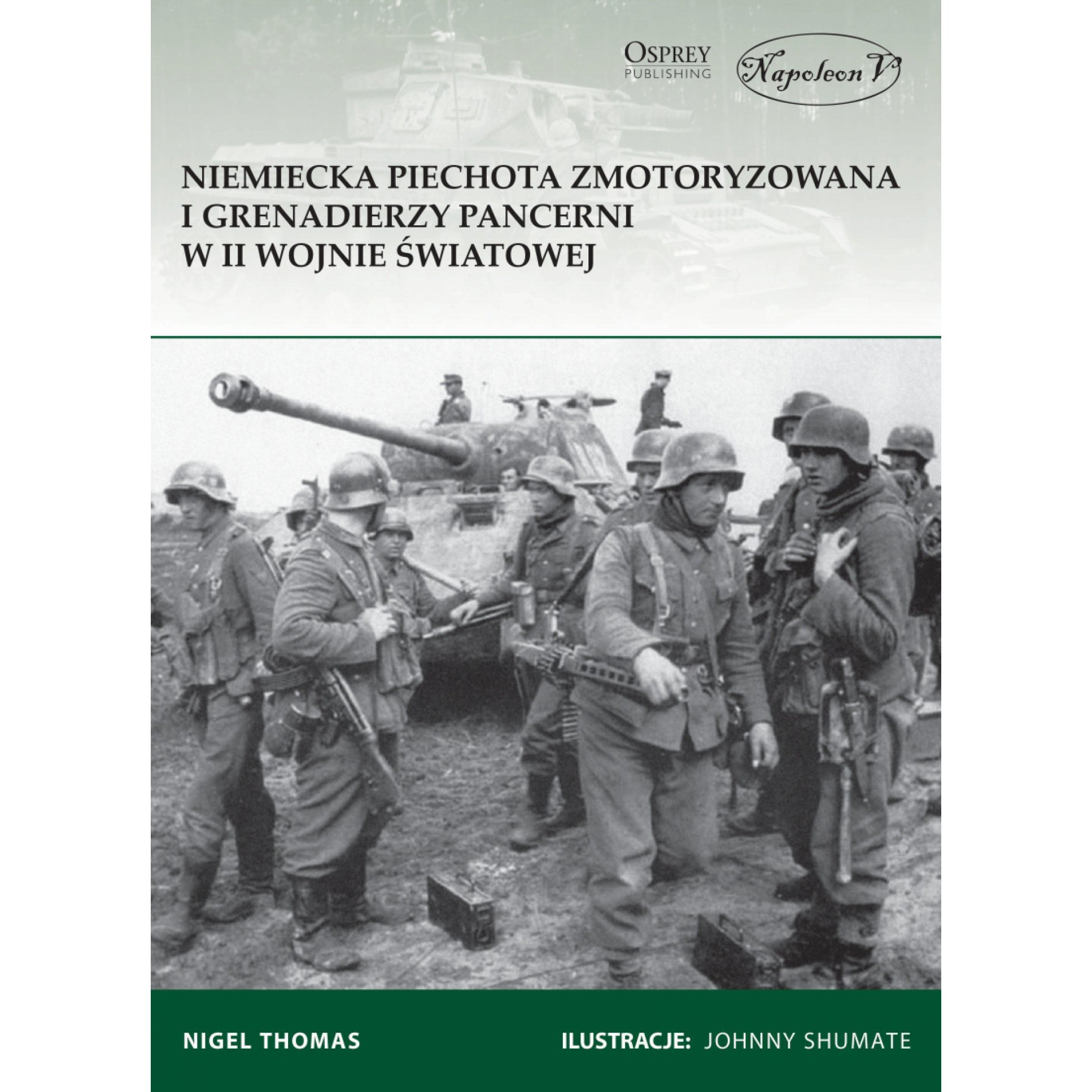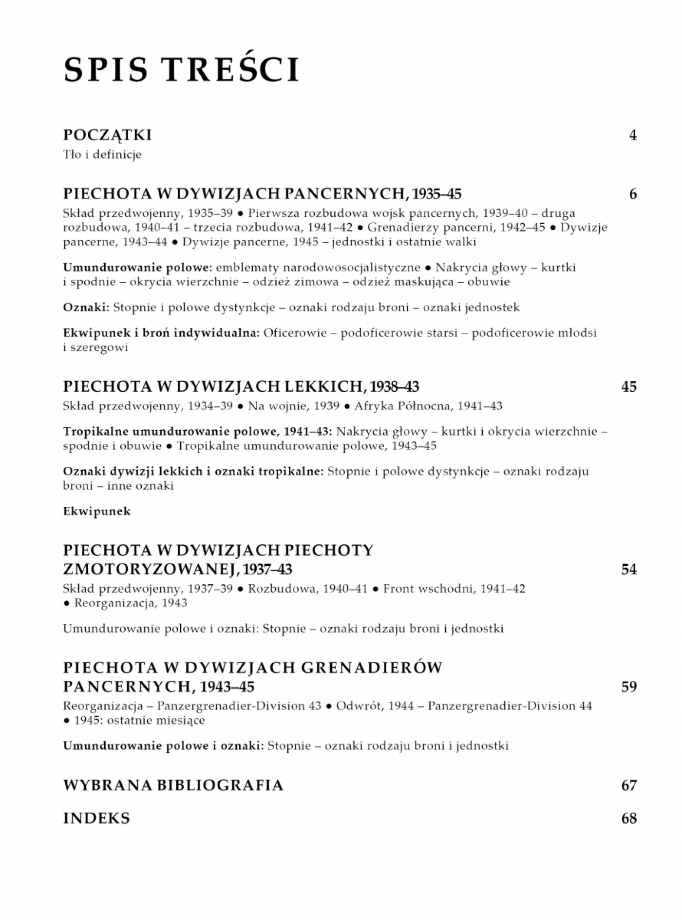 Niniejsze opracowanie śledzi rozwój różnych rodzajów jednostek, które od międzywojnia aż do końca II wojny światowej kształtowały formację grenadierów pancernych. Książka, ukazująca na kolorowych planszach barwnych zmiany umundurowania, ekwipunku i oznak na wszystkich teatrach działań w ciągu całej wojny, stanowi kompletne opracowanie na temat elitarnej piechoty zmechanizowanej Hitlera.