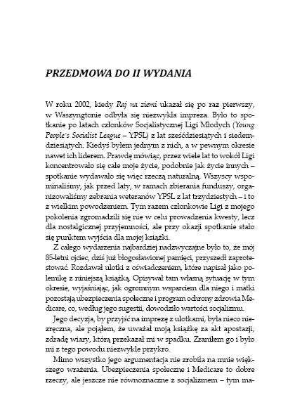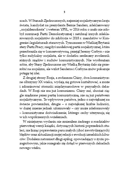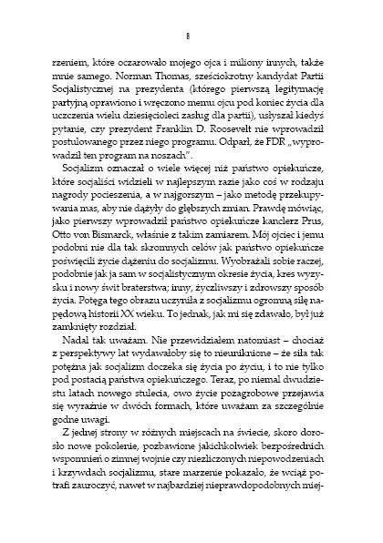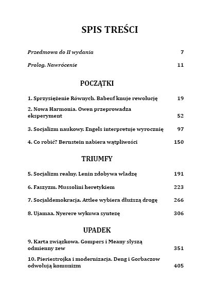 Socjalizm był najambitniejszą próbą, jaką podjął człowiek, by zastąpić religię doktryną powołującą się na podstawy „naukowe”. Każde fiasko w wysiłkach stworzenia społeczeństwa dobrobytu lub wychowania „Nowego Człowieka” inspirowało kolejne poszukiwania drogi do ziemi obiecanej: rewolucję, komuny, socjaldemokrację, komunizm, faszyzm, socjalizm arabski, socjalizm afrykański. Żadna z tych dróg nie okazała się skuteczna, a niektóre pochłonęły oszałamiające żniwo istnień ludzkich. Wreszcie, po dwóch wiekach pobożnych życzeń i gorzkich rozczarowań, socjalizm implodował wśród dekadenckiego dramatu upadających murów i walących się reżimów. Był to zdumiewający finał, lecz później działy się rzeczy nie mniej zdumiewające. Po kilkudziesięcioletniej przerwie odezwały się nowe głosy, jakby nieświadome tego wszystkiego, co było przed nimi, nawołując, aby spróbować na nowo.